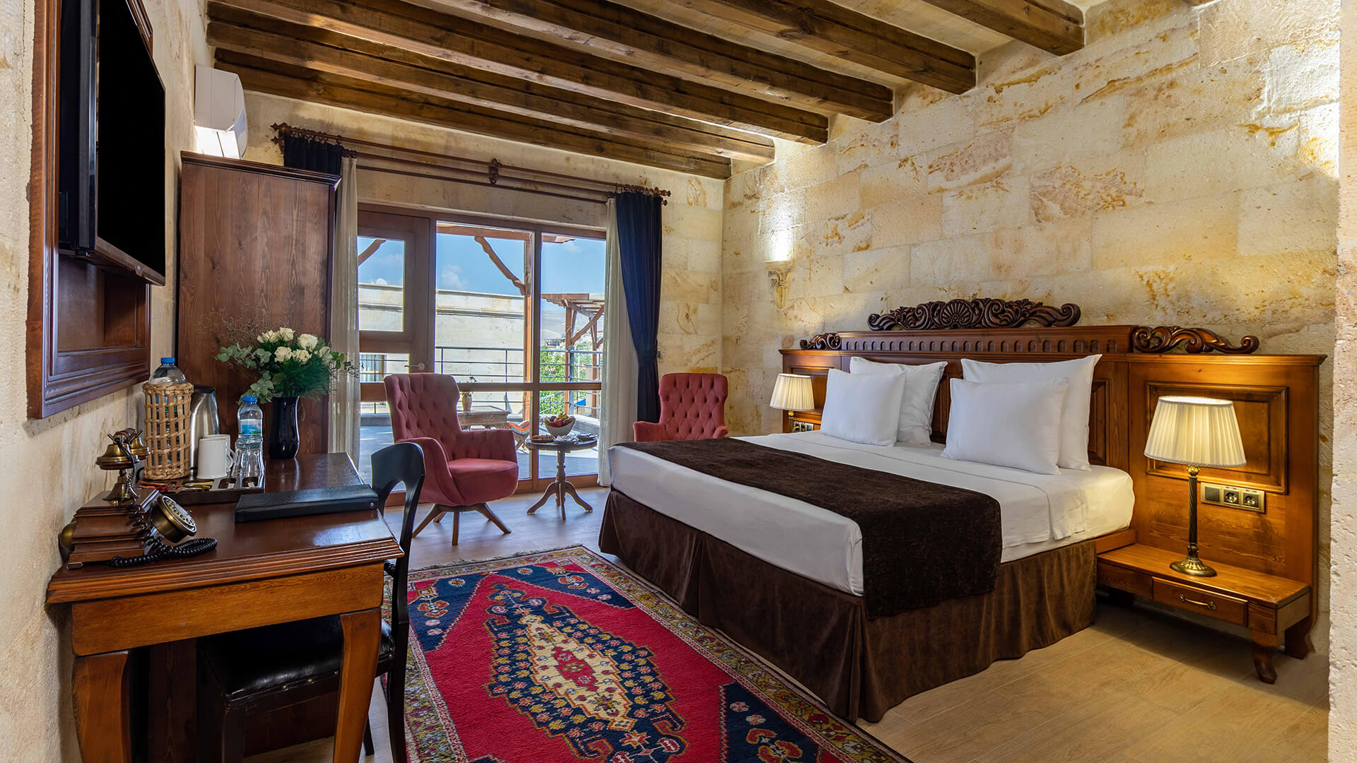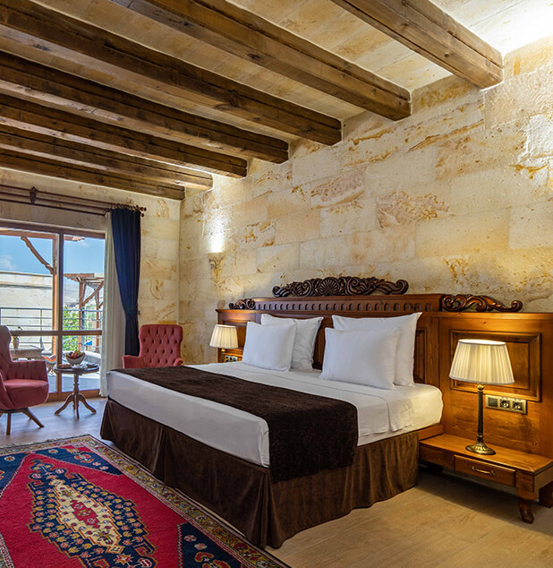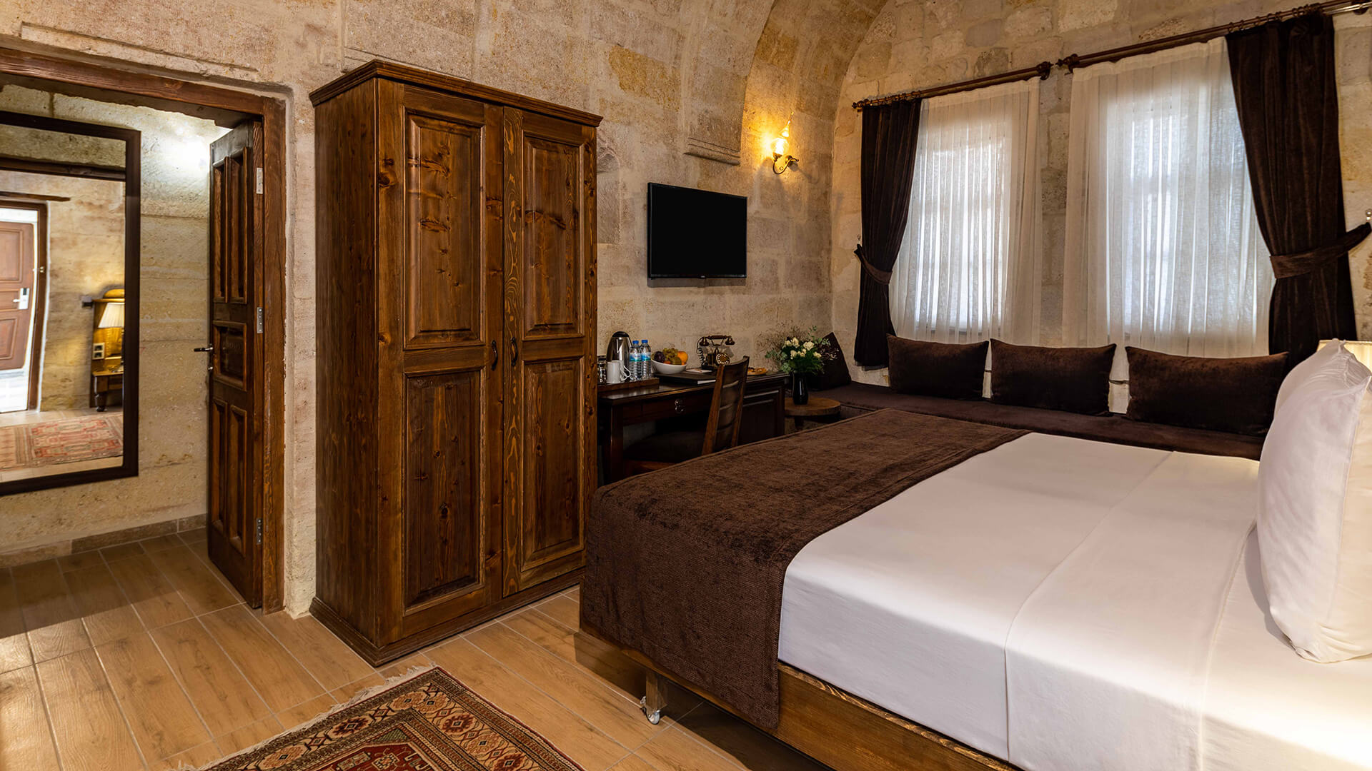 The Deluxe Room draws inspiration from the profound depth hidden within Cappadocia’s stone. Rock cavities that have existed in quiet continuity for centuries are today transformed into a broader and more expansive narrative. The dignified character of the stone is balanced by light flowing through the space and refined, subtle touches. Here, every detail exists not only for comfort, but also to invite pause, feeling, and a deeper connection with the place. The Deluxe Room offers a timeless story that preserves the traces of the past while gently whispering the privilege of the present.