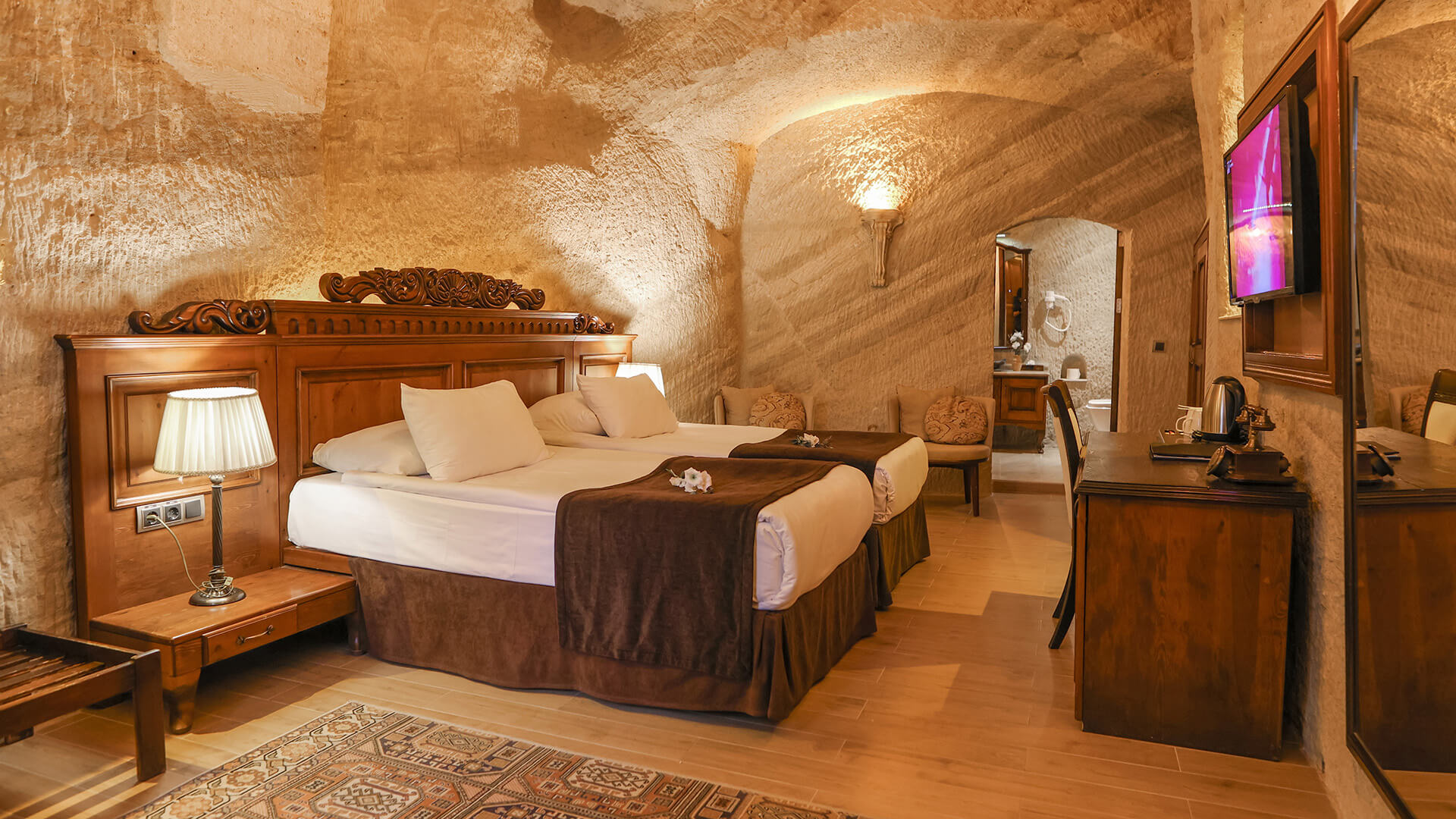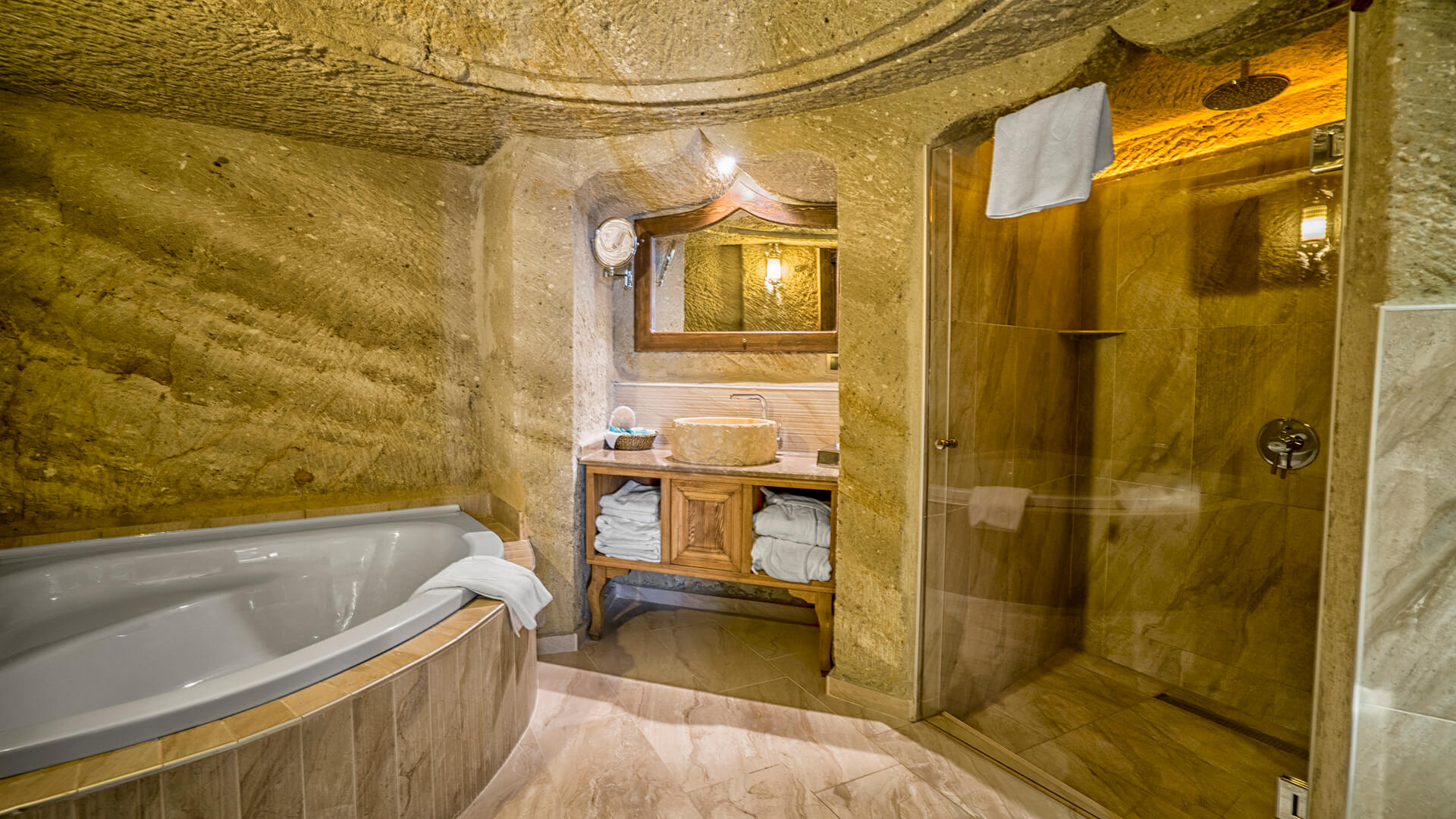 The Deluxe Room draws inspiration from the profound depth hidden within Cappadocia’s stone. Rock cavities that have existed in quiet continuity for centuries are today transformed into a broader and more expansive narrative. The dignified character of the stone is balanced by light flowing through the space and refined, subtle touches. Here, every detail exists not only for comfort, but also to invite pause, feeling, and a deeper connection with the place. The Deluxe Room offers a timeless story that preserves the traces of the past while gently whispering the privilege of the present.
