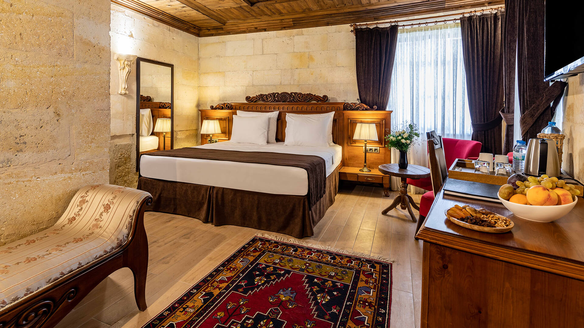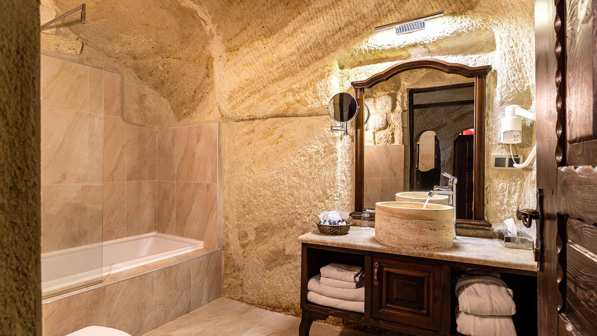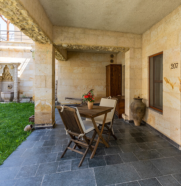 The Junior Suite is born from the sense of expansion and breathing hidden within Cappadocia’s stone. Shaped within the natural rock formation, this space offers a more liberated experience by separating the living area from the sleeping area. The past carried by the stone walls is complemented by volumes deepened through light and refined, understated details. The Junior Suite forms part of a calm and fluid narrative, designed for those who have no place for haste and who wish to experience time at their own rhythm.